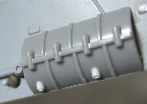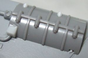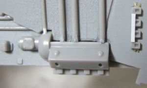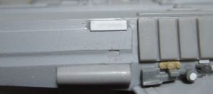 結局ここも手を入れた。ただ、モールドごと削り取って作り直すだけの元気はないので、プラ板の貼り付けと、下側の四角い掘り込みだけでおしまい。(週に何時間も触ってないくせにこんなことをやってるから進まない。)