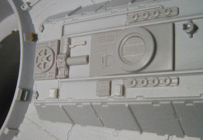 STEP12 D34: 穴から見える壁になにもないと寂しいので、いろいろ貼り付ける。今回はプラ板ではなく、タミヤ1/35や1/48の戦車の履帯を切り貼りした。ディテールがある分、それっぽくなる気がする。