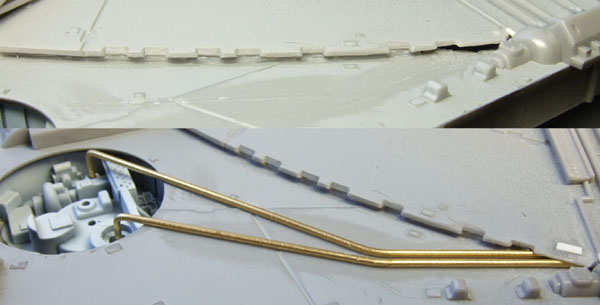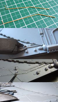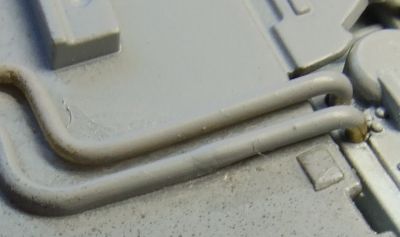 今回の場所は、パイプがボディーの段差に入り込んでるので削るのが面倒。余分な部品をつける前にやっておけばよかっったんだけど、最初はここまでやるつもりはなかったんだから仕方ない。とにかく彫刻等やらピンバイスやらを駆使してプラのパイプを削り落とす。裏側からもガリガリと。最後はアートナイフの腹の部分でならすと割ときれいになる。