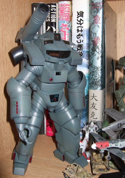 さっき投稿した棚に箱が写っていたので、ついでに1枚。ご存知宇宙の戦士の機動歩兵。元祖パワードスーツ。ガンキャノンの元ネタ。とりあえず塗っただけで墨入れも何もせずに放置中。文庫本の挿絵のイメージでちょっと青っぽく塗ってみた。後ろになにやら年代物の漫画が・・・