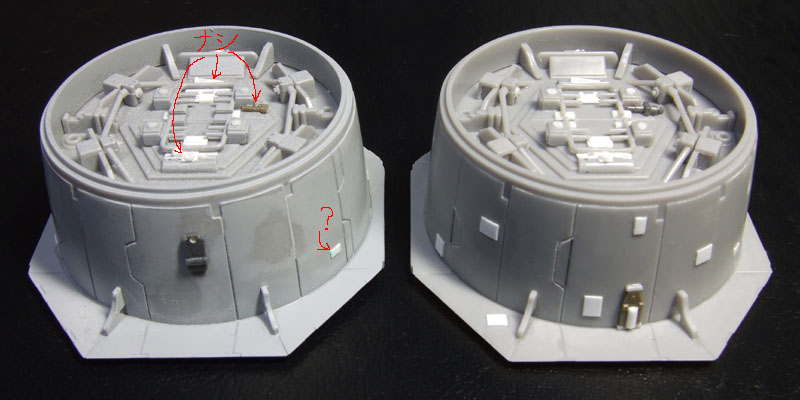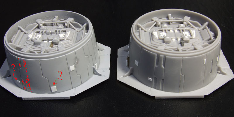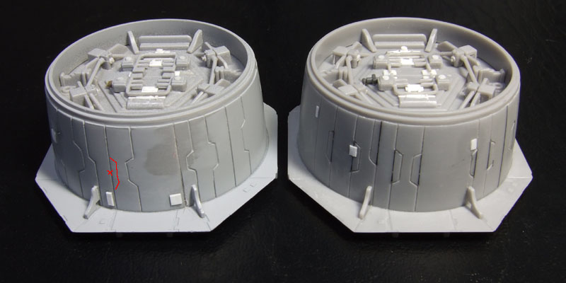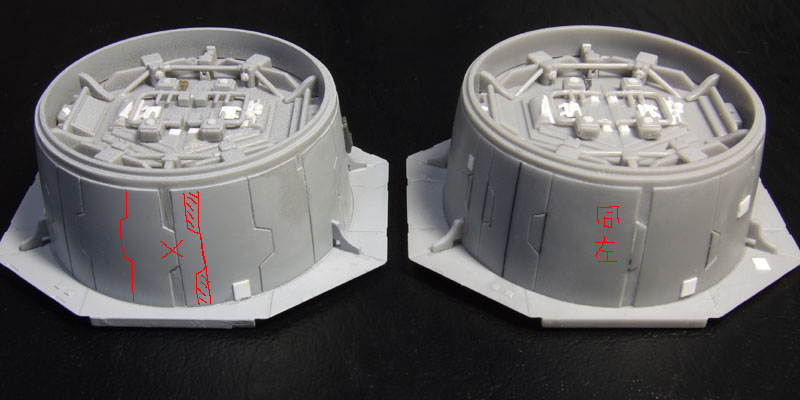 プロップと違うけど、これで完成にする。左側のサフを吹いている方がコックピット側。プロップ写真を見ながら左右のディテールがちょっとずつ違うのを再現。溝は左右で同じと思うんだけど、写真が無くてよくわからないからと、単にサボったから違うものになってる。こうしたらもちょっとプロップに近づくってところを赤で描いてみた。コックピット側は真下と真上はこんなもんだと思うけど横は不明だし、逆側は下半分がよくわからないのであまり信用しないでください。(って誰も信用してないとは思うけど。)