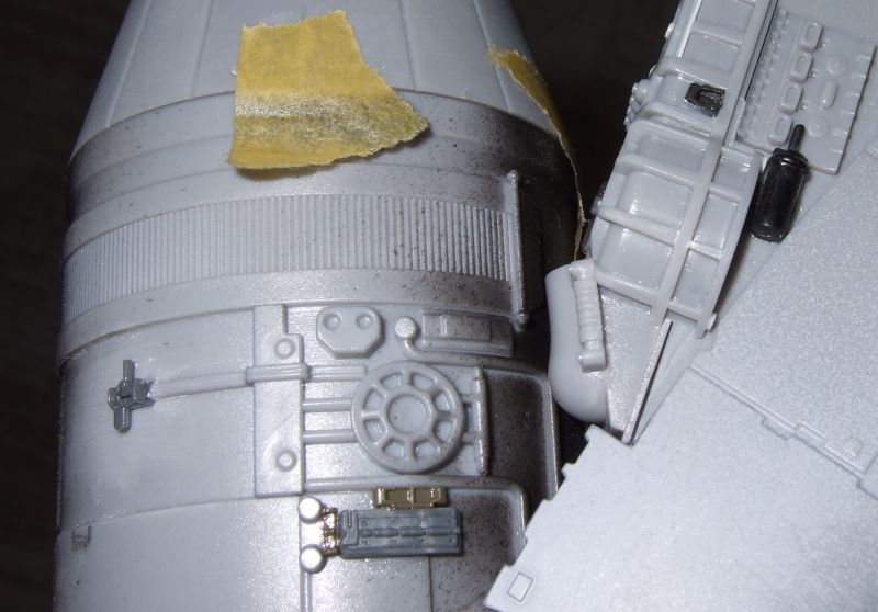 相変わらずちまちま進んでいるミレニアムファルコンの制作。今度はコックピットブロックの下に適当なジャンクパーツを貼り付けた。手持ちのぼやけたプロップ写真を見ても明らかに形が違うけど、このあたりの位置にこんな感じのディテールがついているので追加。その他のディテールは面倒なのでもういじらない。