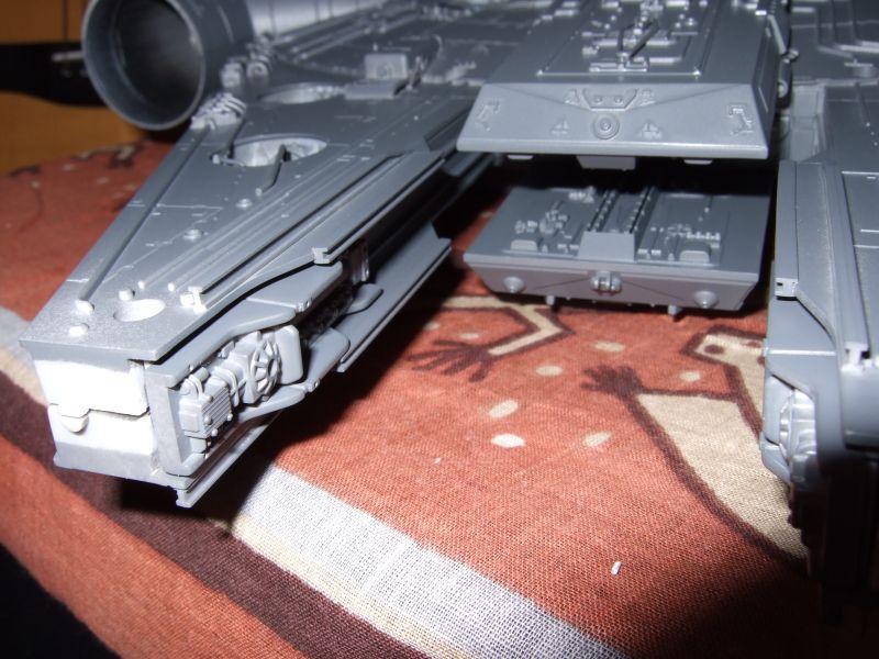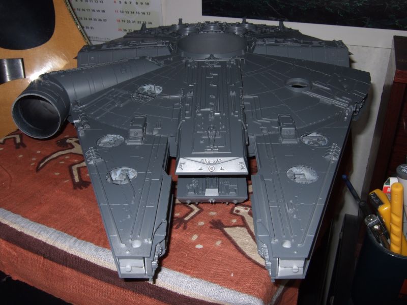 なんだか1/48のX-Wingも発売されそうなので、いいかげんファルコンを完成させないと在庫がたまる一方である。やり残しもたくさんあるが、もともと考えていたよりかなり手は入れてるし、そろそろ観念して塗りにはいることにした。