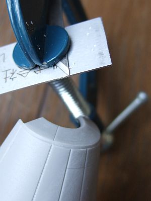 コックピット周りの段差掘りも忘れてたな(というかわざと忘れていたんだが・・・)ということで。道具を組み合わせて筋彫り用のお手軽治具を作成し、こいつで当たりを取ったあと、サイドのブロックでやったように目立てやすりで整形した。