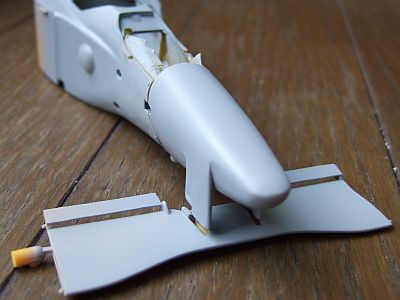 BENETTON B192の方は、ボディーの整形中。フロントウイングのパーツは、塗装しやすいように後はめ式に加工した。