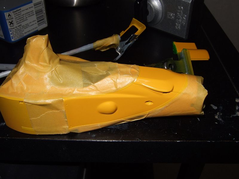 緑の部分にタミヤの指定色缶スプレーパークグリーンを塗るためにマスキングを実施。曲線をきれいに作るにはMODELER'Sのハイテクマスキングテープ2mmが便利。
