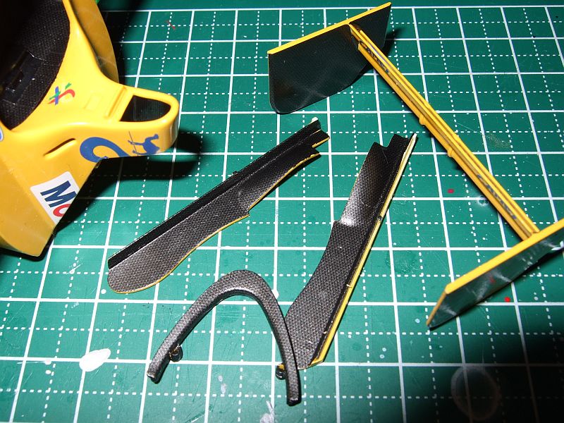 いろんなところにカーボンデカールを貼ってみた。案外、マスキングして黒を塗るより楽かもしれない。特に吸気ダクトの内側なんか、マスキングするのも面倒だし。ただデカール自体が高いのが難点。なのでコックピット内側は余ったデカールの切れ端を小刻みに貼ったりしている。