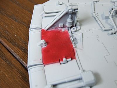 マスキングをして赤い部分を塗った。そこいら辺にあった赤系の色をいろいろ混ぜてかなり赤っぽい色にした。先日購入したダブルアクションのエアブラシをはじめて使ったんだけど、なかなかよい感じ。静かだし。でも慣れないせいか、気が付いたらエアだけ出てるってことも。