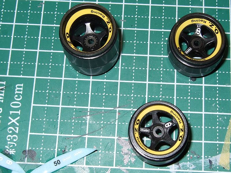ホイールのデカールを忘れてたので、貼ってからクリアがけ。黄色い帯がなかなか面倒。