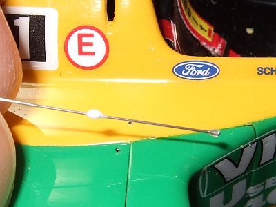 特徴的な触覚みたいなアンテナだけは再現しておこうと思っていろいろ悩んだ挙句、ギターの弦で作ることにした。先と接着位置ちょい下に木工用ボンドを盛り付け、0.3mmのピンバイスで開けておいた穴に差し込んで固定した。