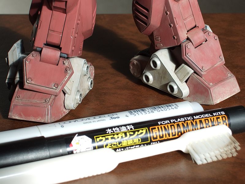 さらに足元に砂埃がついたようにしようということでガンダムサンドブラウンを使ってみた。つや消しになってくれるのはいいんだが、塗った跡がペンで描いたようになってしまう。コピックのブレンダーペンで伸ばしてもうまくいかない(左側)ので、歯ブラシを使ってみると案外いい感じになった(右側)。さらにその後でタミヤのウエザリングマスターAセットのサンドとかをドライブラシっぽくなすりつけてみた。なんか単調だな~。プロともなるとこの辺りのセンスが違うんだろう。