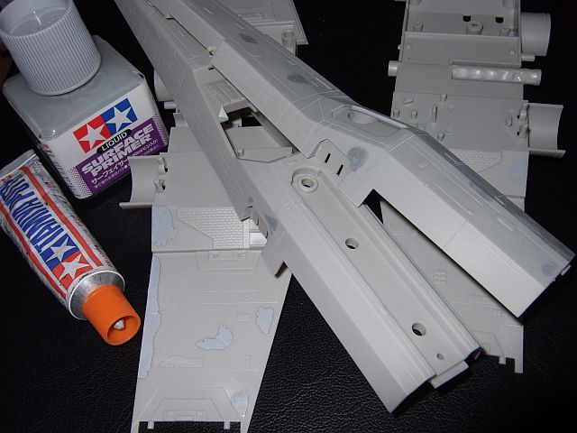 ぶつぶつ言っても始まらないのでパテ埋め開始。タミヤのどろどろのやつが案外いいかも。とりあえずモールドを削り取るなんでことは無しで。