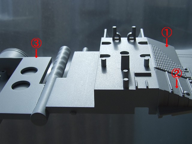 写真の①や②のヒケがなかなかきれいにならない上、③の部分の隙間を埋めるなどということに手を出してしまったからさらに進まない。しかしタミヤのビン入りの液状サーフェイサーとMr.サーフェイサーは相性が悪いのだろうか。Mr.サーフェイサーを吹くとはじいてしまうというか、1回では表面ができあがらない。下地側がきちんと固まっていないのか、それとも溶け出してしまうのか・・・。まあ、最初の下地仕上げが悪いというのもあるんだろうけど。タミヤのサーフェイサーを使ったら違いがあるんだろうか。 瞬間接着剤だと溶け出すことはないけど、固くて削り難いし。そういえば光硬化パテなんてのもあったな。あれはどうなんだろうか。