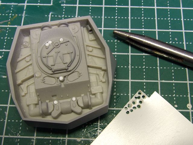 お尻のパネルにもディテール追加。薄い円盤を作るのがなかなか面倒。穴あけポンチでプラペーパーを丸くくりぬいたものを貼ったり、ランナーの余りをナイフで薄くカットしたり。さらに小さい円盤ができないかと、試しにシャーペンの先をポンチ代わりしたら結構いけた。