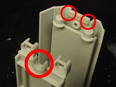 それと、MG誌に載ってた翼の後はめ加工も忘れずにやっておく。下側は記事の通りで、上側の2つ並んだ丸のあたりもちょっと削っておいたほうが入りやすい気がする。
