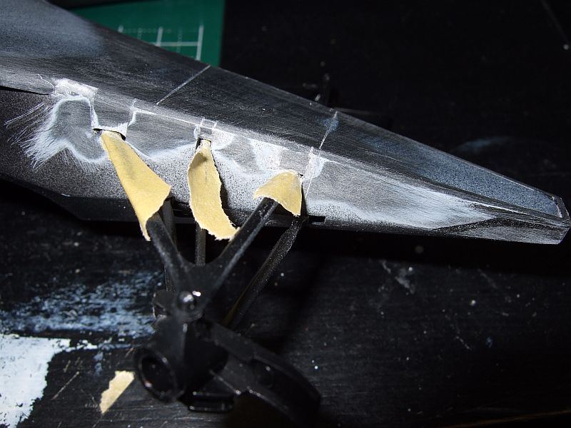またまた唐突にMP4/5Bを製作。今回はフロントサスを組み立ててモノコックを貼り合わせておしまいに仕様かと思ったが、やはり継ぎ目くらいはきれいにしておこうと思い、瞬間接着剤をパテ代わりにして整形した。