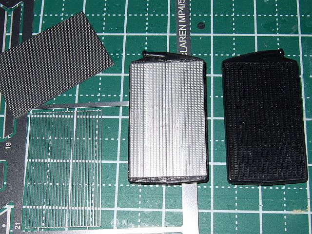 エッチングのラジエターグリルを貼ってみた。エッチングパーツなんか普段使ったことが無いやつがやってるのでとにかく大変。特に外側の細いパーツを貼るときなんか、瞬間接着剤がはみ出て仕方が無かった。