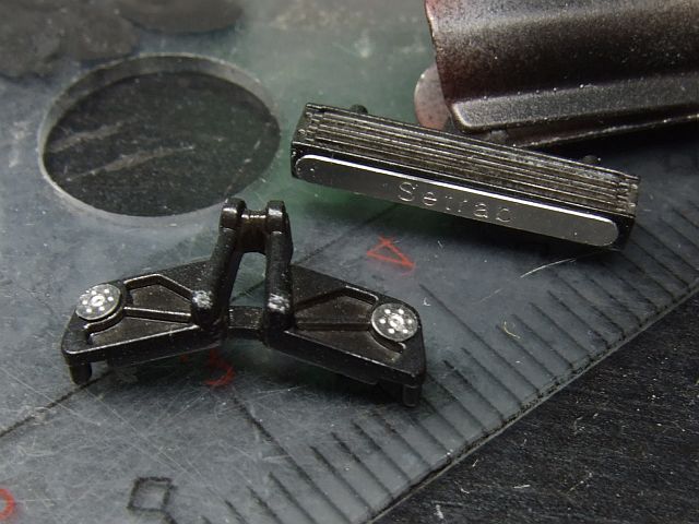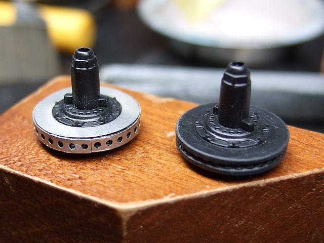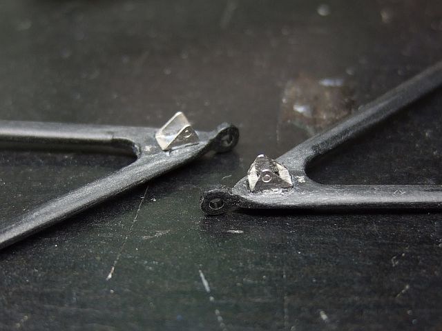 ブレーキまわり用のエッチングパーツを貼ってみた。なんか、単に貼っただけでは違和感大ありだ。で、貼るのをやめた。(貼らないほう(右)がカタチ的には本物に近いのだ。本物にもパーティングラインはあるのだあぁぁ・・・。)
