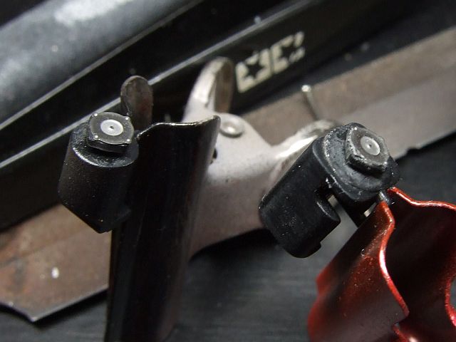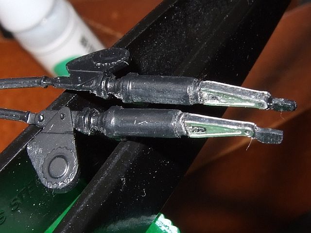 あと、左手前は、フロントサスのエッチングパーツを貼った部品。取説の貼り方だと接着面がなくなるのでこっちに貼った。