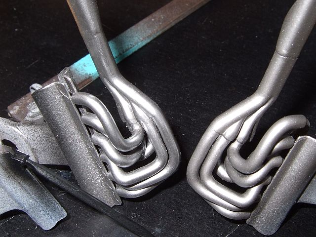 エギゾーストにはMr.メタルカラーのステンレスを吹いた。右が吹いたまんまで、左が布や綿棒で磨いた後。そこそこテカって金属っぽくなる。