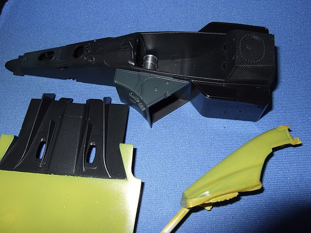 モノコックとフロアを塗装しました。ただの黒じゃなんだから、タイヤブラックや18番ブラックグリーンやレッドブラウンをちょっと混ぜて塗ってみたが、それでも黒にしか見えなかったので、ラジエター部分はブラックグリーンのみで塗ってみたがこれはちょっと違うかもという感じになってしまった。あと黄色い部分はかなり雑になった。もう少し赤みがあってもよかったかも。