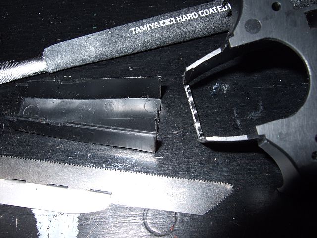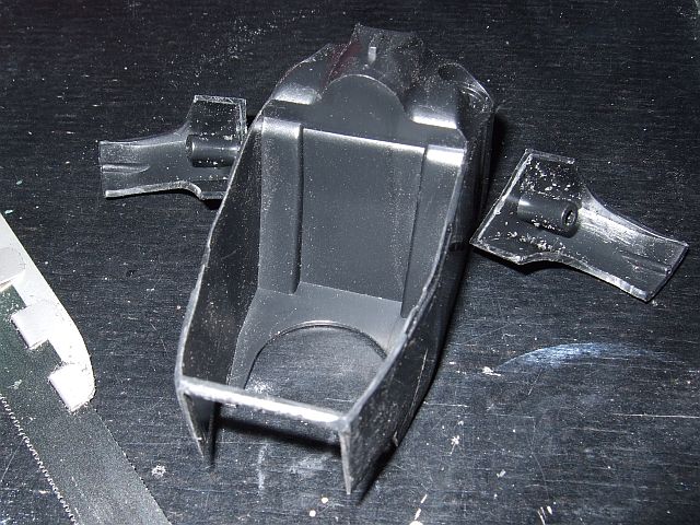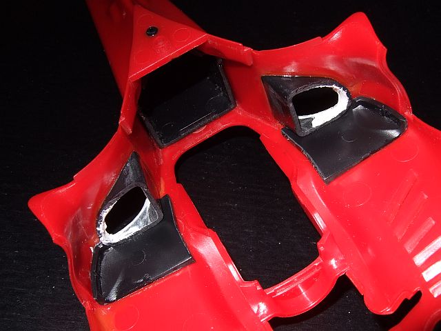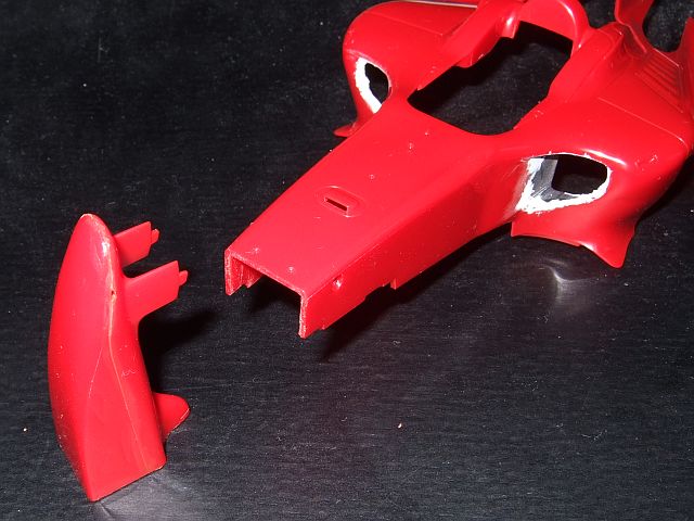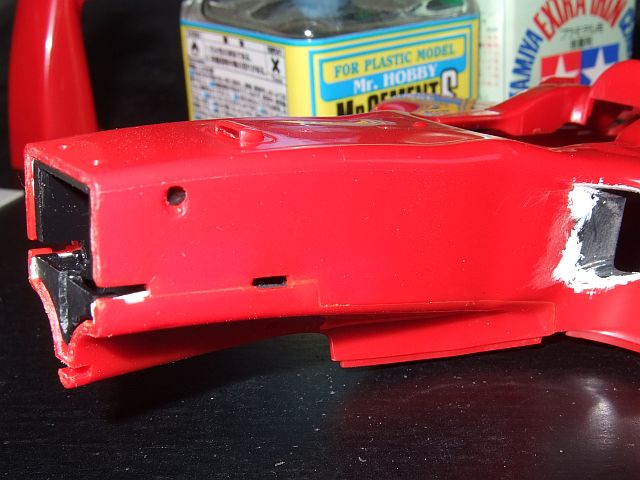 ここもぶった切らないと後はめできない。あと、すでに完成された方のブログにもあったけど、ラジエターダクトが当たるカーブしてる部分を削っておく。 そうしないとカウルが浮いてきれいにしまらない。