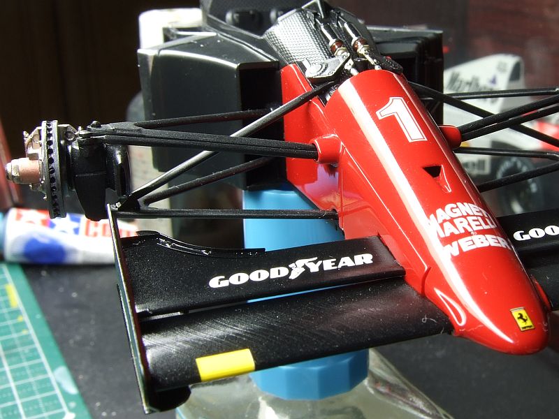 フロントウイングの組み立て完了。エッチングパーツがいい感じ。結局、ウイング関係のデカールの上にもクリアを吹いた(研ぎだしはしてないけど)。