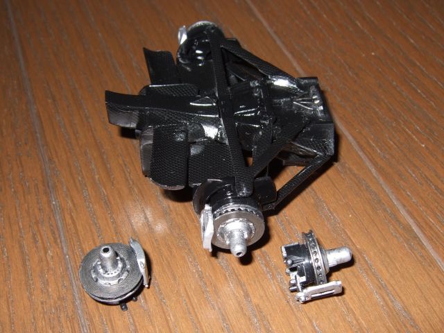 ブレーキだのアップライトだのを筆塗りして接着。かなり雑。見えないからいいし。あと、カーボンデカールを貼らなきゃいけない箇所がまだまだ残ってる。細かいので大変そうだな~。どうやって手を抜こうか・・・。