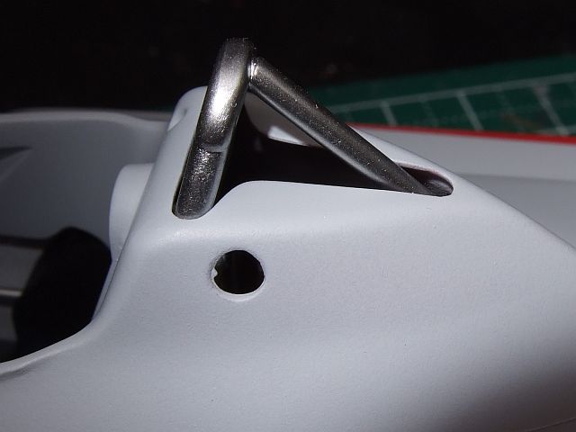カウルにサフを吹いて段差修正など実施。写真のとこの縁が厚いとさすがに目立つんで、薄く削った。