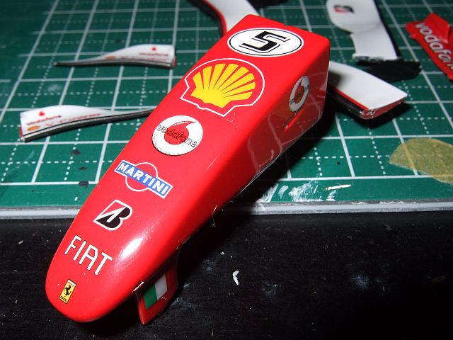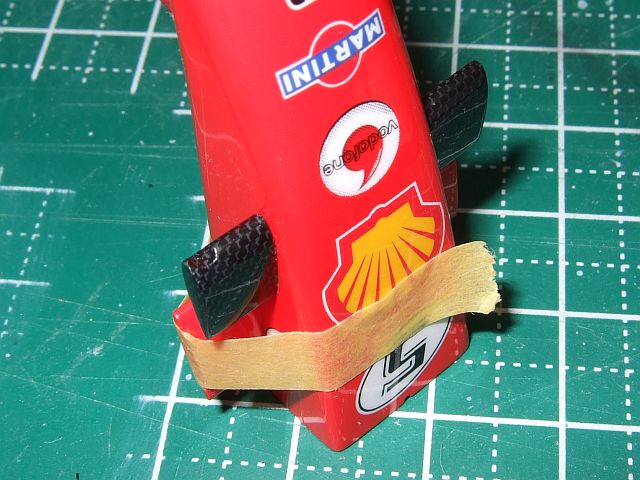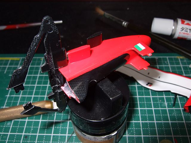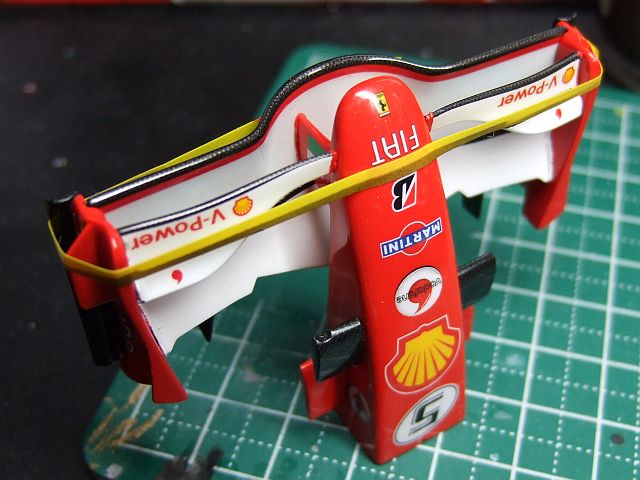 組み立て終わり。ボディー側と合わせて水平を確認しながらくっつけた。位置決めは計画的に慎重にやるもんなんだろうけど、私の場合、いつも場当たり的にやってしまう。今回も上側のウイングとエンドプレートの間にすき間ができてしまって、結局エンドプレートを再接着するはめに。