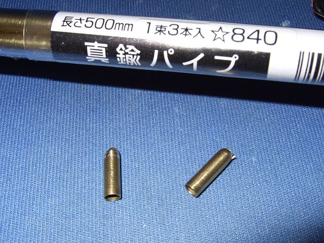 エギゾーストは真鍮パイプで作ってみた。ちゃんと切れる道具をもってないんで、端っこを活かしてなんとかカットし、メッキシルバーを塗って(ビンに浸けただけ)、