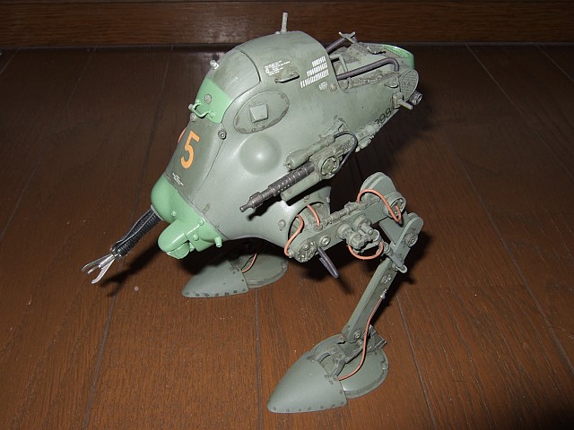 2時間後、こうなった。でかいので筆塗りはしんどい。買ってきたまんまの色ではなく、ちょっと黒や濃緑色を混ぜた色で塗ってみた。