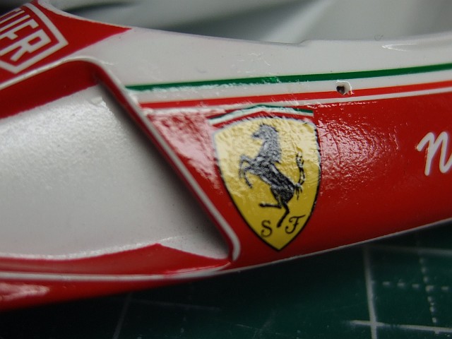 あと、白いラインが切れてるのに気づいたんで、これも筆でリタッチして、今度は缶スプレーでドバっとクリアを吹いて、なんとか誤魔化す。(写真は露出オーバーできれいに見えてるだけ。)