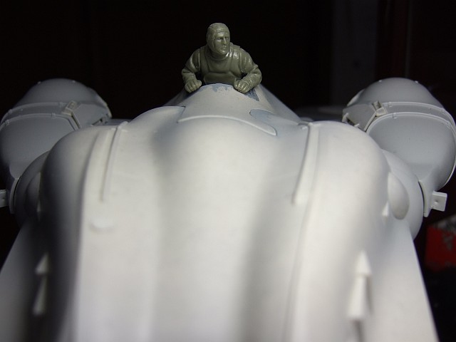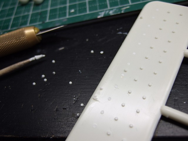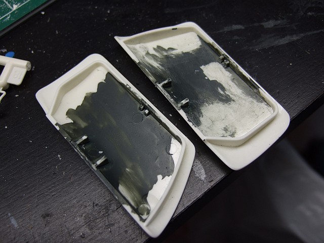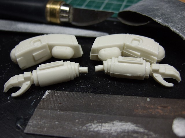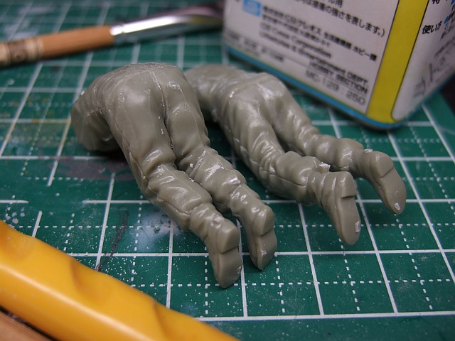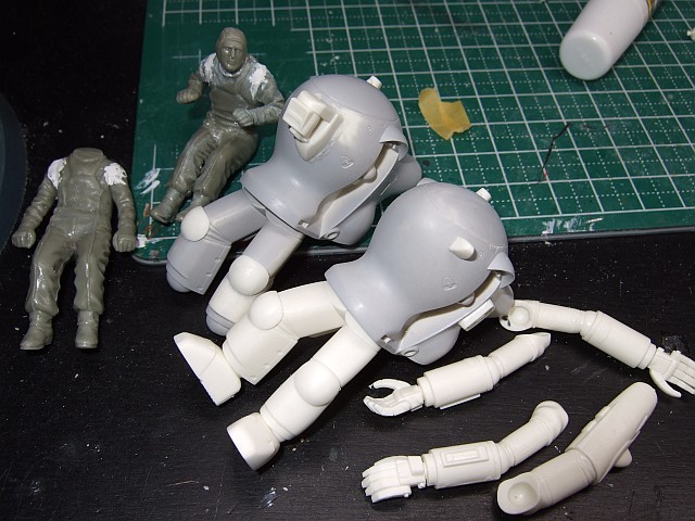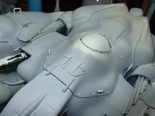 本体の方はというと、胸びれ(アンテナかスタビライザー?)の裏に押し出しピン跡があったんで、がしがし削る。雑だけど、まあ目立たないし、丸いのが残ってるよりまし。