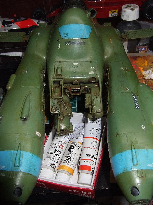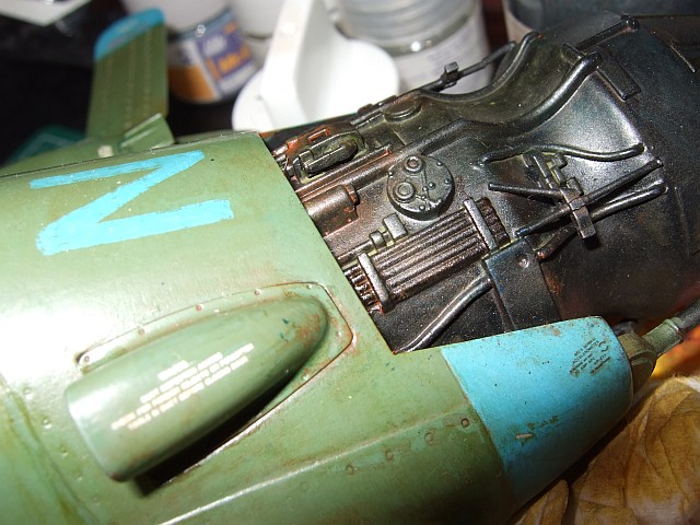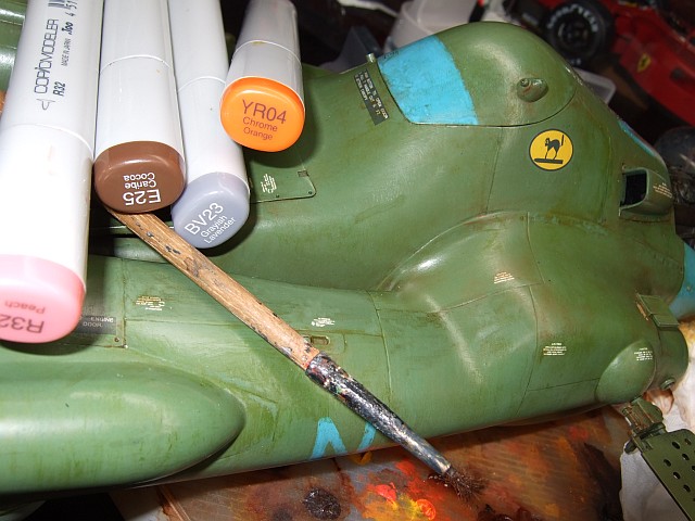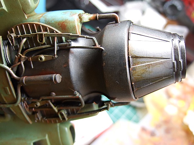 特にエンジン周りは暗いんでカラフルに。コピックで物足りなくなったらまた油絵具を使う。バーミリオンヒュー(ほぼ朱色)とかを重ねると派手に錆びた感じになってイイ。しかし未来兵器が錆びるのか?