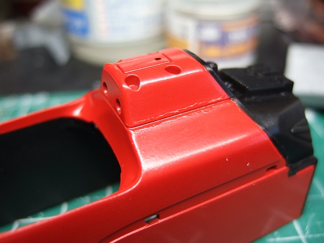 このパーツ、雑誌の作例ではどれもパテで継ぎ目を消してるんだけど、実車の写真を見ると継ぎ目があるんでそのままに。ただ、段差が大きいのでクリアを塗ってちょっとだけ埋めてみた。