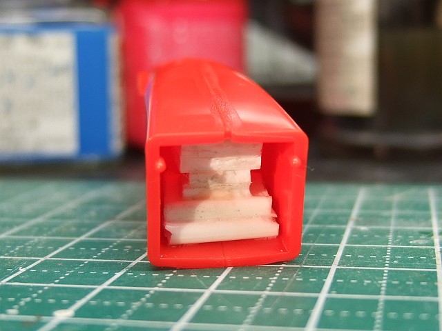 ノーズが左右に分割されてるんで、あとでヒケないようにしようってことで、早めに接着してしまうことにした。凹まないように、雑誌の作例をまねして中にプラ板を埋め込んでみた。