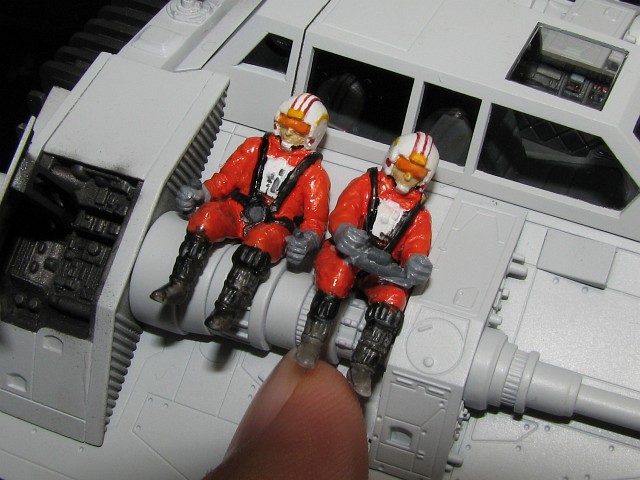 で、二人完成。なんか胸のディテールがX-WINGのパイロットみたいだぞ。手元のSNOWSPEEDERのパイロットの写真を見ると、胸には白いパーツがついてるみたいだったんで、白くしておく。
