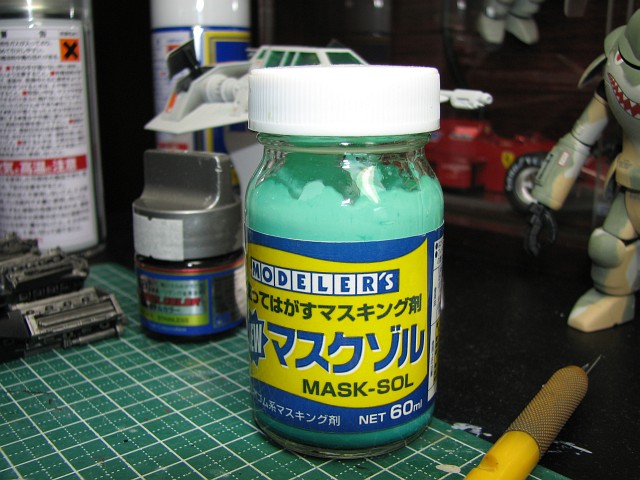 今回、何を思ったか先にウインドウをはめてしまったためにマスクが必要になったんだけど、そんなとき便利なのがこれですよこれ。あとからカットできないタイプのマスキング剤だけど、爪楊枝でぺとぺと置いていって、ちょっとはみ出しても乾きかけの時にめくってやってと言う感じで、マスキングテープ使うより気楽にマスクできる。しかも剥がすのが楽。