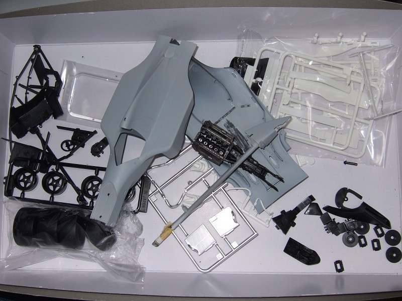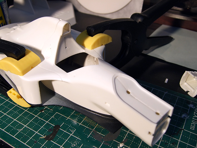 フジミのFW16。仮組みしてみたらどうしてもカウル浮いてしまって閉まらない。最初はなんともなかった気がするんだけど。悩んだ挙句(というか、半分シメシメ)、接着することに。瞬間接着剤を使用。