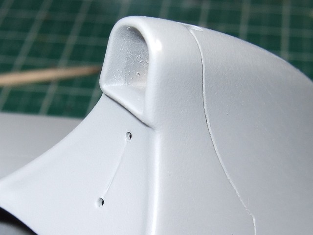 エアインテイク部拡大。穴の下側が別パーツになってるんでここの接着線消しは楽でいいけど、ボディーとの境目をならすのはやっぱり面倒。とりあえず境目が見えなくなったらよしとする。(真ん中辺はパーツがかぶさるのでなんもしてない)