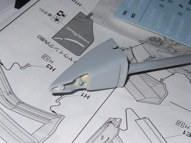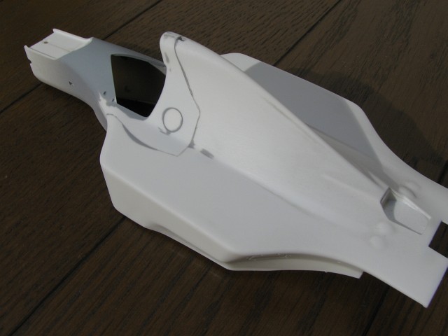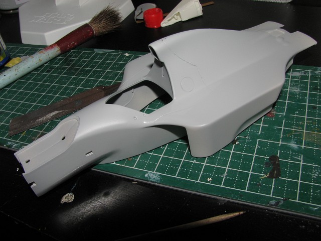 もういっぺんサフ吹く。カウルの分割ラインに瞬間接着剤がに染みこんで一部埋まり、それをホジホジしてたらよれてきて、やり過ぎて瞬着で埋め、また・・・といういつもの負のスパイラルに。なかなか綺麗にならないんでそこそこで止め。