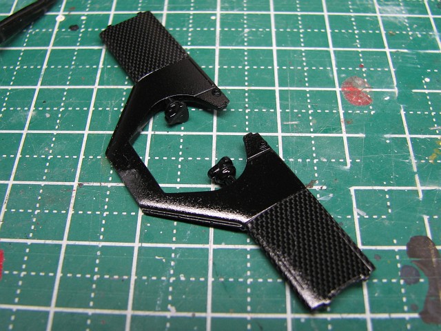 黒く塗ったままでいいかと思ったけど、ついついリアのアッパーサスアームにカーボンデカールを貼ってみた。248F1のときに使った安いやつなんでスモーク吹く必要ありかも。