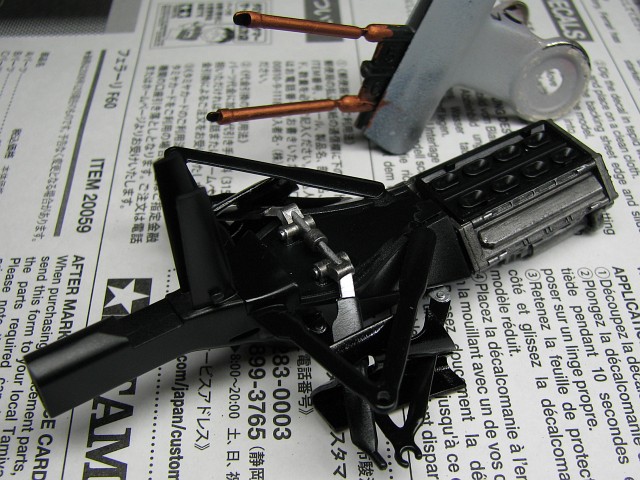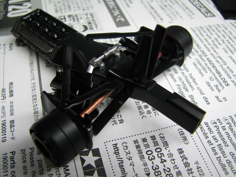 F60のリアサス周りを作成。タミヤのキットを組むときはアラインメントなんか全く気にしなくていいくらいカチッと決まる。ドライブシャフトはメタルカラーのカッパーを筆塗り。エンジンブロックもダークアイアンの筆塗り。アルミ色のがよかったかも。