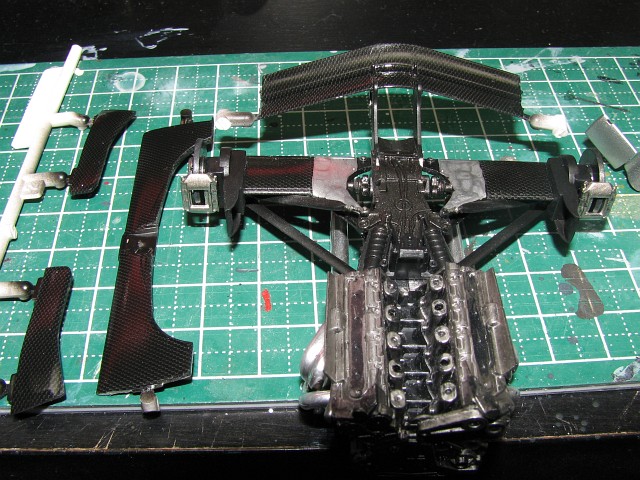 まったりと進んでいるFW16。今日はウイング類に貼ったカーボンデカールのパターンがきつかったのをスモークを吹いて落ち着かせ(写真で見るとまだキツイけど)、リアアップライトを組み込んでリア周り完成。シルバーの部分はタミヤのペイントマーカーで塗っただけ。どうせカウルクローズで作るから隠れて見えんし。ウイングはまだ接着してないよ。
