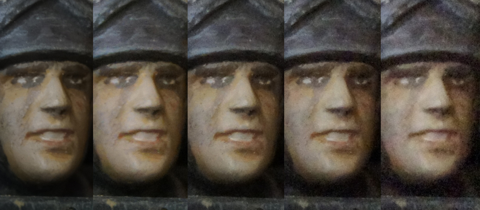 別角度の写真で。一番左からISO1600のマルチショットNR,1600,3200,6400,12800。マルチショットNRにすると1回のシャッターで6連写して合成される。同じISO1600でもノイズが低減されてるのがわかる(特に影の部分)。