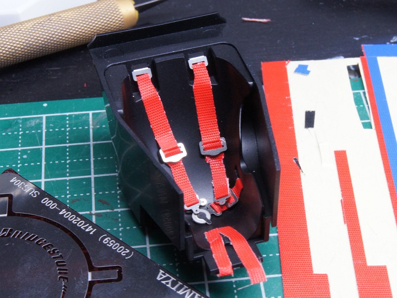 F60のシートベルト作成。金属パーツは付属のものを使った。ゲートレスなんで切り出し不要。楽だ。ベルト部分も付いてたけど、質感優先ってことでモデラーズのシールのあまりを切りだして使ってみた。
