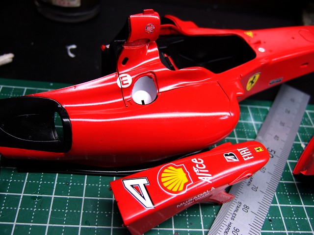 で、日曜日くらいからデカールを貼り始めた。FW16に比べたら楽なんだけど、このEマークとか、微妙な位置にあるんで気を使う。