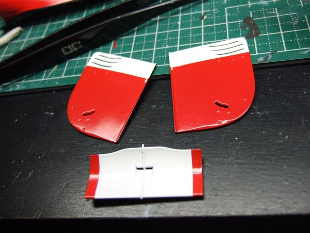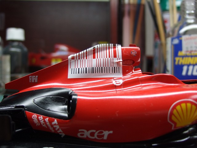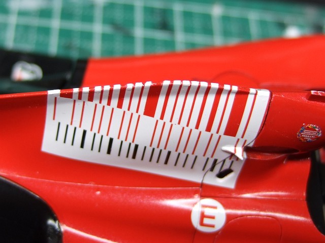 それからちまちまと貼り進めて最後に背ビレの部分が残った(TAB DESIGNのデカールを使う)。これが結構クセモノで、ボディーを仮置きしておいて位置を決め、片側をまずこんな感じで張って(一部切れ込みいれてる)、そこそこ乾いてからナイフでカウルの継ぎ目に沿って切り離し、背ビレの部分を適当に処理し、続いて反対側をってことなんだけど、