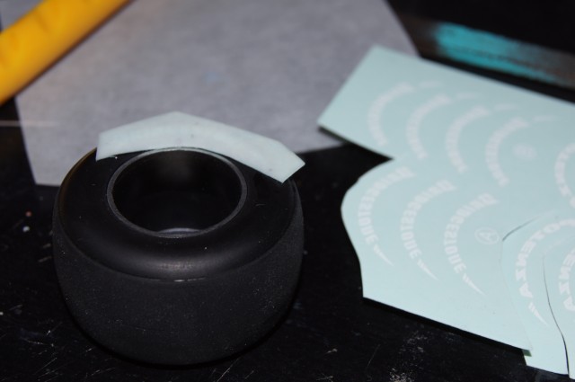 F60のタイヤにデカールを貼る。向きを間違えないように!(と思っていたのに間違えたわけだけど・・・)